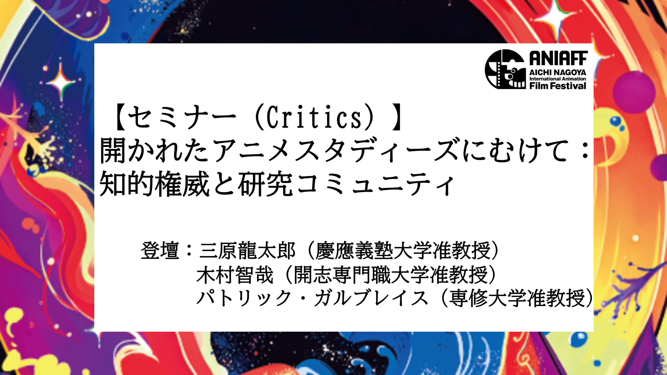 英語圏における日本アニメ研究は、アニメのグローバル化の進展と並行してここ30年の間に一定の蓄積がなされ、日本国内外で広く参照されるようになっている。他方で、そのような英語圏アニメ研究が英語圏以外のアニメ研究に対して帯びる知的権威のあり方や、英語圏アニメ研究コミュニティがそのような権威をどのようにして維持・再生産しているのかといった点については、これまで自覚的に検証されてきたとは言い難い。このような問題意識の下、本パネルでは、英語圏アニメ研究のとりわけ日本語圏アニメ研究に対する権威化のプロセスを批判的かつ詳細に検討することを通じて、その権威からの脱却の方策を模索するとともに、より開かれたアニメ研究の未来を展望する。